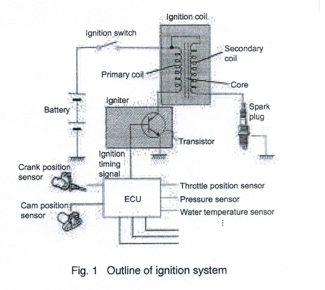 點(diǎn)火裝置的概要如圖Fig.1示,為了使高度壓縮的混合氣體產(chǎn)生電火花,必須在火花塞的兩個(gè)電極之間加上高壓,通過(guò)點(diǎn)火線圈產(chǎn)生高壓,放電電壓通常在10kV~15kV,最大也有超過(guò)30kV的。電流有在數(shù)十mA,比起點(diǎn)火的時(shí)機(jī)會(huì)使引擎的輸出,發(fā)射都會(huì)發(fā)生變化,為了遵從各引擎條件最佳點(diǎn)火時(shí)機(jī),對(duì)于點(diǎn)火線圈產(chǎn)生高壓的時(shí)間進(jìn)行控制是非常必要的,通過(guò)對(duì)電流通斷的控制從而控制點(diǎn)火線圈產(chǎn)生高壓,以各種傳感器的信號(hào)為條件由ECU決定后執(zhí)行點(diǎn)火。
